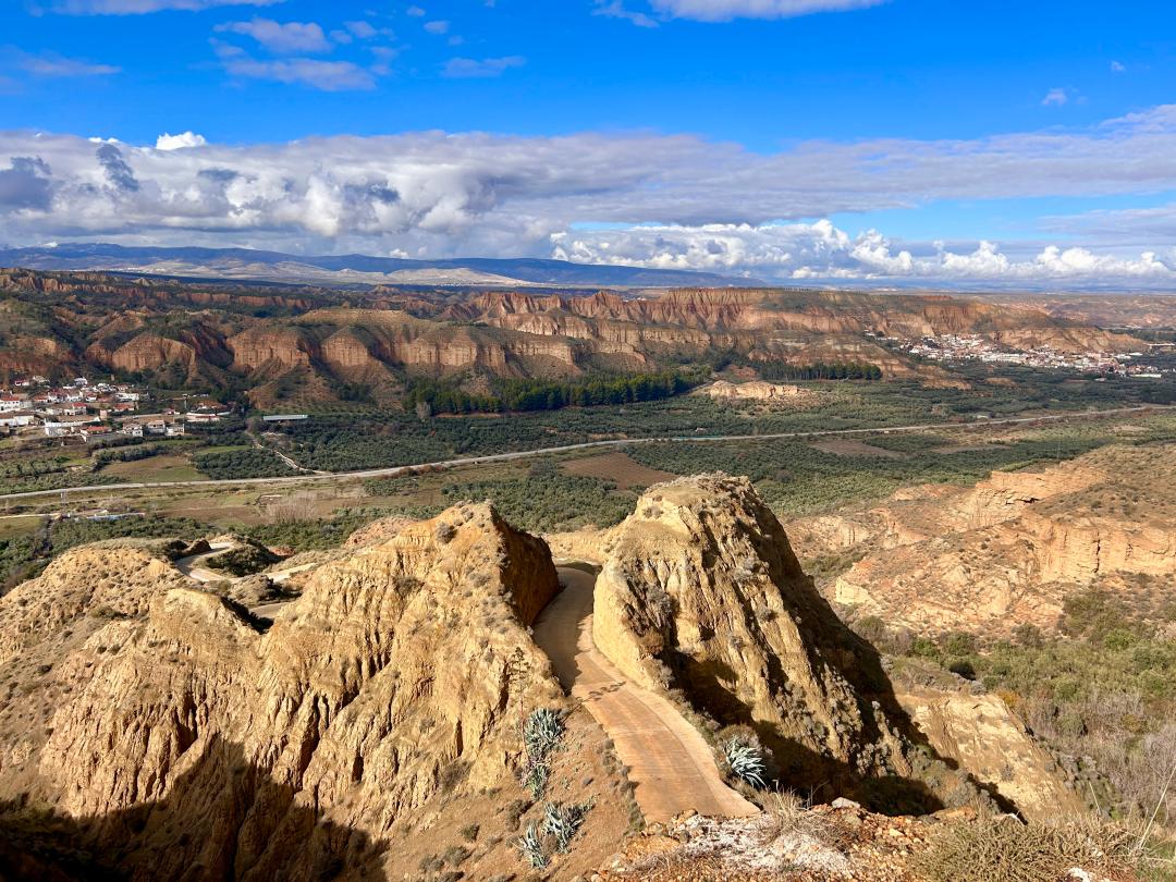 What unfolds below is not emptiness but complexity. Cave chimneys dot the hills like quiet signals of human presence, while dry riverbeds carve pale lines through the earth. The view makes clear why Guadix developed the way it did—why people went underground, why agriculture clings to certain edges, why roads follow particular contours.