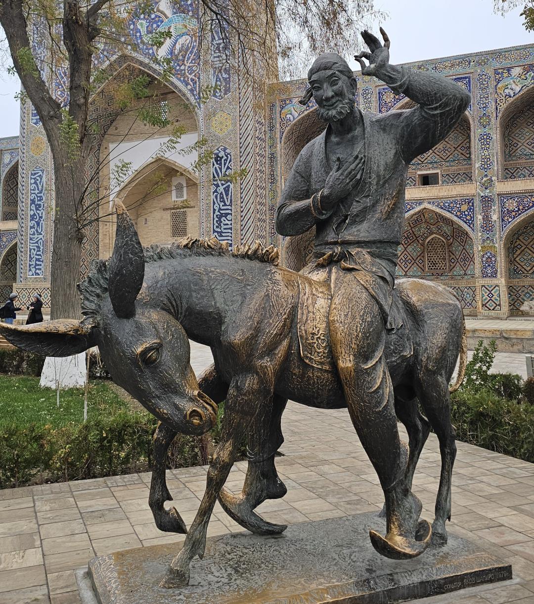 Почему его памятник стоит именно в Бухаре? О приключениях Ходжи Насреддина написал 2 романа советский писатель Леонид Соловьев. По одному из произведений был снят фильм, в котором Ходжа Насреддин путешествует по Бухаре и попадает во двор Бухарского эмира. И настолько этот персонаж прижился в Бухаре, что даже стал национальным символом и в 1979 году ему устанавливают памятник. Ежегодно весной в Бухаре проводится фестиваль юмора в честь Ходжи Насреддина. В Бухаре даже существует поверье, если посадить ребенка на ослика Ходжи Насреддина, то его жизнь будет наполнена радостью и морем положительных эмоций.